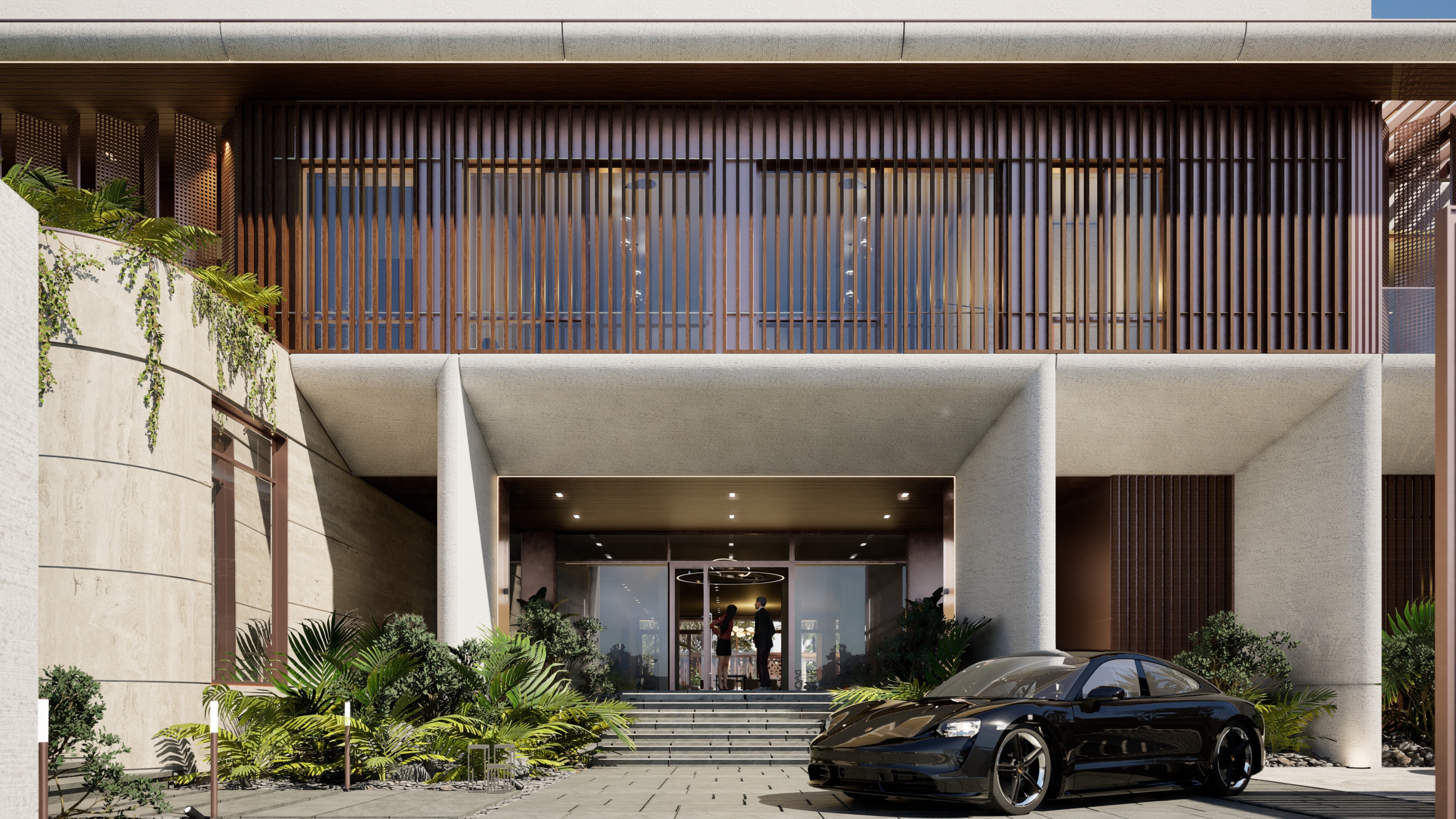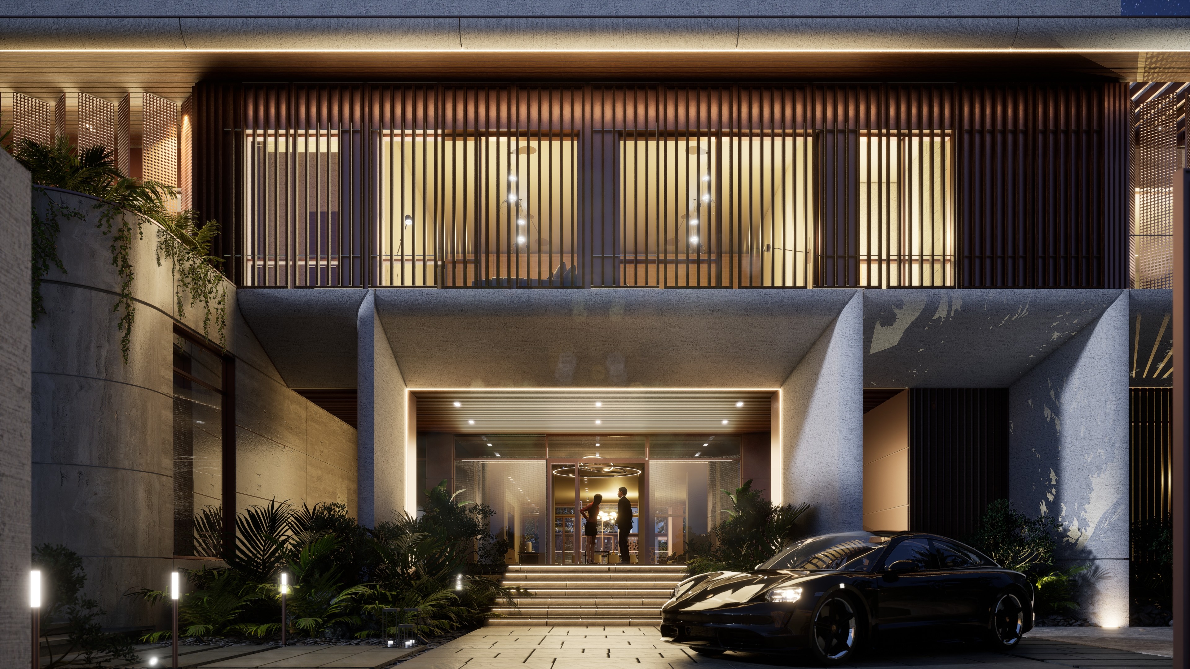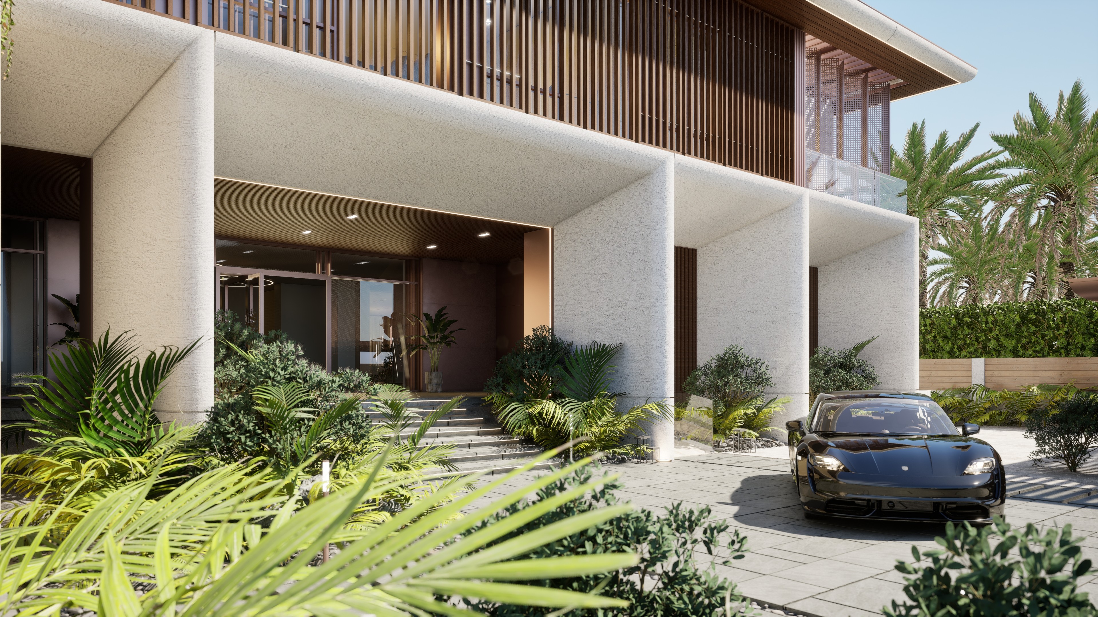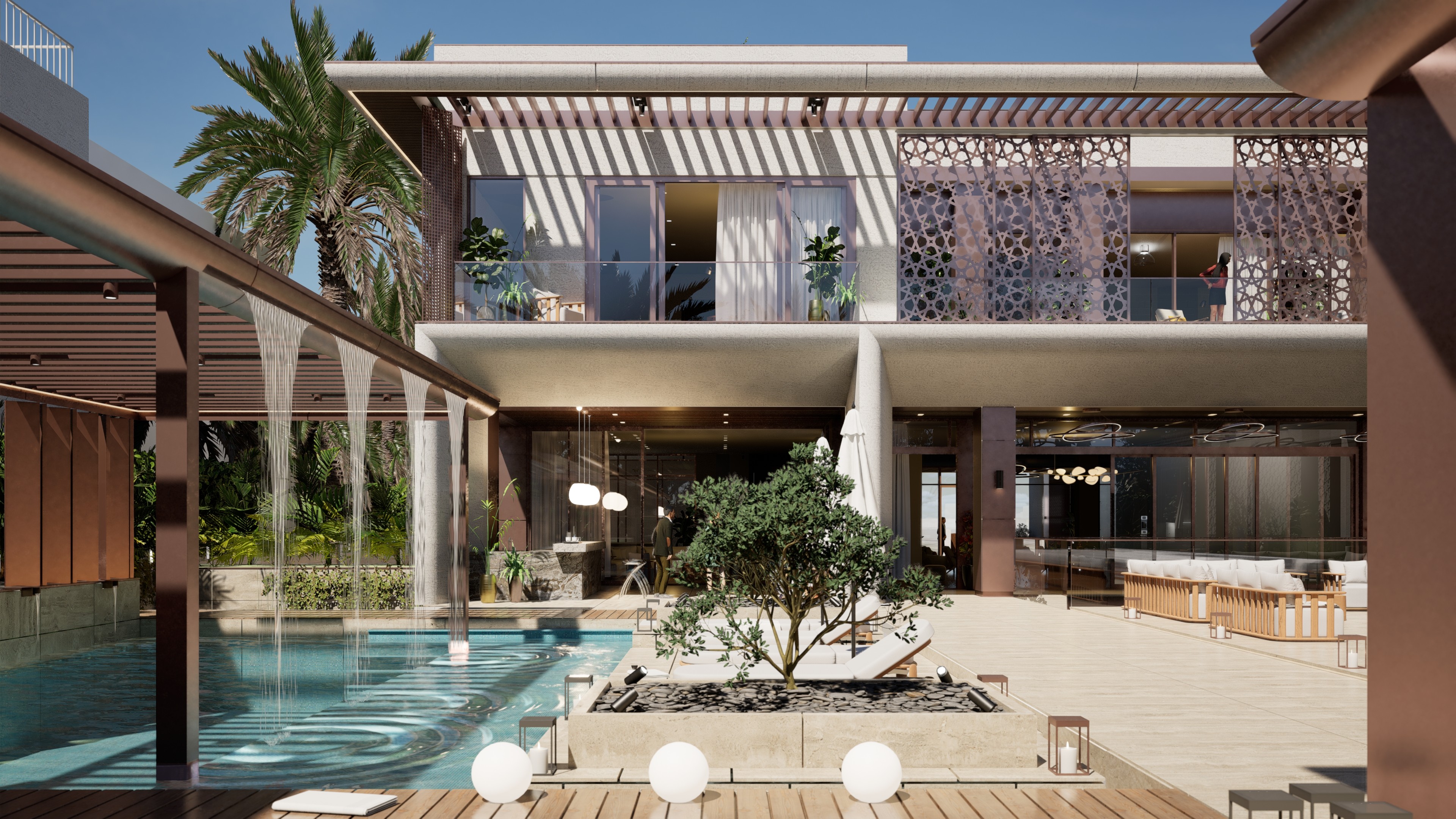 Visualisation and animation services for a large luxury villa in Emirates Hills, Dubai, produced in support of Nellis Architecture. The design language is rooted in a contemporary reinterpretation of Arabic architectural tradition — textured stone facades carrying geometric patterned relief, deep-set timber louvres and laser-cut bronze screens filtering the Gulf light, and a courtyard arrangement that draws the outside in around a generous pool terrace.